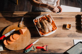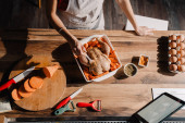 Młoda kobieta cięcia słodkie ziemniaki podczas gotowania w kuchni w domu