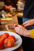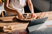 Młoda kobieta nosi fartuch za pomocą komputera tablet podczas gotowania kurczaka w kuchni w domu