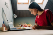 Młoda kobieta w fartuchu gotowania i toczenia ciasta z pinezką w kuchni w domu
