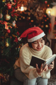 Boże Narodzenie koncepcja, młoda Azjatka pije kawę i patrząc choinkę ze szczęściem.