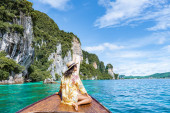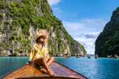 Zdjęcie "Para przed łodzią Longtail w lagunie Koh Phi Phi Thailand. Pileh Lagoon Tajlandia Tajskie kobiety i mężczyźni kaukaskie przed Longtail łodzi w Tajlandii" może być wykorzystywane do celów osobistych i komercyjnych zgodnie z warunkami zakupionej licencji Royalty-free. Obraz jest dostępny do pobrania w jakości wysokiej rozdzielczości do 5760x3840.