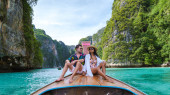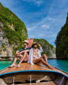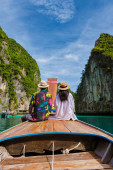 Para przed łodzią Longtail w lagunie Koh Phi Phi Thailand. Pileh Lagoon Tajlandia Tajskie kobiety i mężczyźni kaukaskie przed Longtail łodzi w Tajlandii