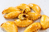 Świeżo upieczone empanadas z wiśni w frytkownicy na blacie kuchennym.