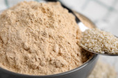 Mąka sezamowa w ceramicznej misce na białym stole, zbliżenie