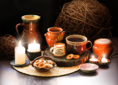 Starożytna wiejska Ukraina wiek gorąco smaczne słodkie ciasto latte pot bar ciemny czarny deska biurko przestrzeń tekstowa. Close view Ukraińska kultura smażyć dieta spodek woda słoik symbol noc nawet ogień płomień światło martwa natura
