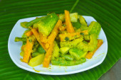 Pisang goreng lub placki bananowe z Indonezji serwowane w drewnianym talerzu. Zdjęcia studyjne