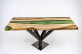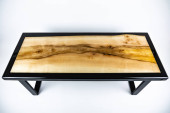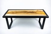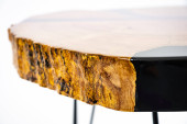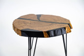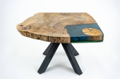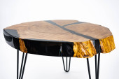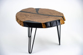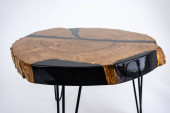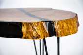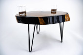 Stolik kawowy, stół w salonie. Ręcznie robiony stół z żywicy. Na białym tle.