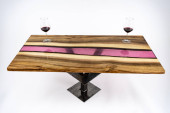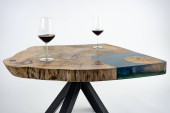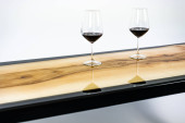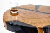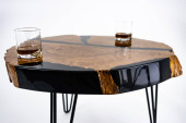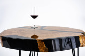 Stolik kawowy, stół w salonie. Ręcznie robiony stół z żywicy. Na białym tle. Szklanka whisky na stole. Szklanka wina na stole.