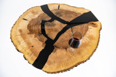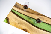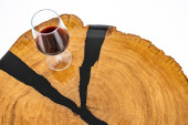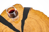 Stolik kawowy, stół w salonie. Ręcznie robiony stół z żywicy. Na białym tle. Szklanka whisky na stole. Szklanka wina na stole.