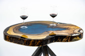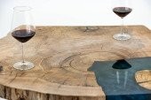 Stolik kawowy, stół w salonie. Ręcznie robiony stół z żywicy. Na białym tle. Szklanka whisky na stole. Szklanka wina na stole.