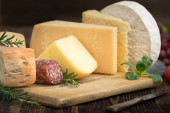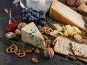 Różne domowe kawałki sera z miodem, owoce, ciasteczka i orzechy na stole. Świeży nabiał, zdrowa żywność ekologiczna. Pyszna przystawka.