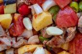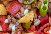Zdjęcie "Widok z góry na tureckie danie Guvech - pieczone mięso z bakłażanem i tradycyjnie serwowane w garnku (nazwa turecka; etli patlican guvec)" może być wykorzystywane do celów osobistych i komercyjnych zgodnie z warunkami zakupionej licencji Royalty-free. Obraz jest dostępny do pobrania w jakości wysokiej rozdzielczości do 5760x3840.