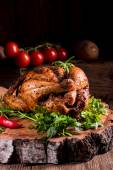 Pieczone nogi kurczaka z cytryną z tymiankiem i czosnkiem na ciemnym talerzu na drewnianym stole
