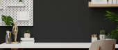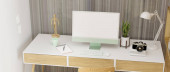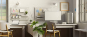 Zdjęcie "Nowoczesny wystrój wnętrz pracowni z pustym komputerem PC i akcesoriami na drewnianym stole z szarą ścianą z półką pegboardową i ścienną, rośliną domową. 3d renderowanie, ilustracja 3d" może być wykorzystywane do celów osobistych i komercyjnych zgodnie z warunkami zakupionej licencji Royalty-free. Obraz jest dostępny do pobrania w jakości wysokiej rozdzielczości do 5760x3840.