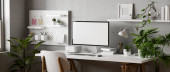 Nowoczesny wystrój wnętrz pracowni z pustym komputerem PC i akcesoriami na drewnianym stole z szarą ścianą z półką pegboardową i ścienną, rośliną domową. 3d renderowanie, ilustracja 3d