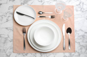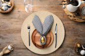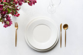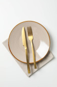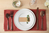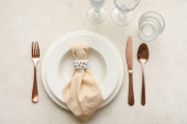 Talerze z serwetką z tkaniny, ozdobny pierścień i sztućce na białym drewnianym stole, płaskie układanki