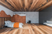Wąska i stylowa sypialnia z dużym przytulnym łóżkiem i nowoczesnymi dekoracjami