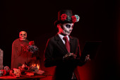 Santa muerte pani pracuje na laptopie w studio, sprawdzając stronę internetową online na bezprzewodowym komputerze. La Cavalera Catrina modelka w kostiumie i czaszce tworzą dios de los muertos. Strzał ręczny.