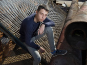 atrakcyjny i stylowy, jasnowłosy młody biały facet pozujący z poważną twarzą ubrany w sweter i dżinsy w strefie przemysłowej pod niebieską żelazną ścianą i niebieskim pochmurnym niebem. niższy kąt