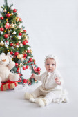 Mikołaj. Piękne dziecko. Wesołych Świąt i szczęśliwego Nowego Roku. tło choinki