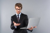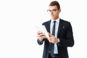 odnoszący sukcesy biznesmen w garniturze przy użyciu tabletu cyfrowego odizolowanego na szaro