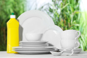Zestaw czystych naczyń na białym stole na rozmytym tle