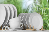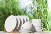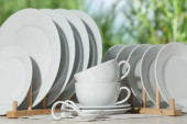 Zestaw czystych naczyń na białym stole na rozmytym tle