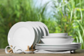Zdjęcie "Zestaw czystych naczyń na białym stole na rozmytym tle" może być wykorzystywane do celów osobistych i komercyjnych zgodnie z warunkami zakupionej licencji Royalty-free. Obraz jest dostępny do pobrania w jakości wysokiej rozdzielczości do 5760x3840.