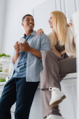 radosna blondynka siedzi na kuchennym stole obok afrykańskiego chłopaka z filiżanką kawy