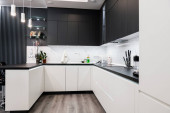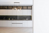 nowe jasne Studio Kuchnia z białymi meblami i oświetleniem