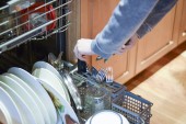 Kobieta z pełną zmywarką do naczyń do prac domowych w kuchni