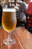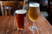 Pint glasses of cold fresh british ale and lager beer served in old vintage English pub
