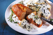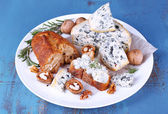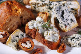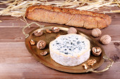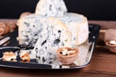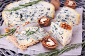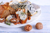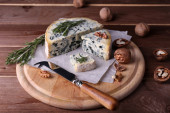Ser pleśniowy z gałązek rozmarynu i orzechy na pokładzie z arkusza papieru i drewniany stół tło