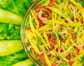 pikantna sałatka pieprz marynowane warzywa plastry azjatyckie jedzenie gotowe do gotowania pyszne przekąski zdrowy posiłek jedzenie przekąska na stole kopia przestrzeń jedzenie tło rustykalny widok z góry