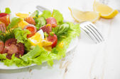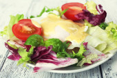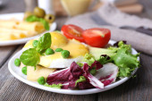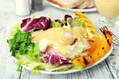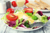 Tosty z jajka Benedykta i pomidor płyta na drewnianym stole
