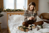 Wesoła biała kobieta siedzi na łóżku i pakuje prezenty świąteczne w domu
