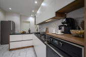 Białe nowoczesne luksusowe meble kuchenne z czarnym blatem blatowym