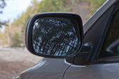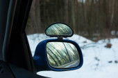 Lustro w śniegu. Zamrożone lusterko wsteczne. Zimowy pomysł. Część samochodu.