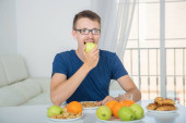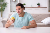 Młody człowiek z nadwagą wybiera owoce zamiast fast food przy stole w kuchni