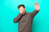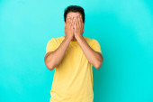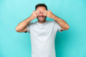 Średniowieczny biały mężczyzna odizolowany na niebieskim tle pokrywa oczy dłońmi