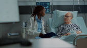 Zdjęcie "Afroamerykańska lekarka wypełniająca zabiegi medyczne, kartoteka chirurgiczna starszego pacjenta z opieką paliatywną. Chorzy starsi mężczyźni rodzina słuchanie instrukcji leków od młodej pielęgniarki." może być wykorzystywane do celów osobistych i komercyjnych zgodnie z warunkami zakupionej licencji Royalty-free. Obraz jest dostępny do pobrania w jakości wysokiej rozdzielczości do 5760x3840.