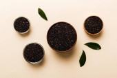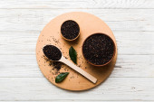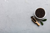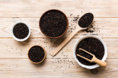 nasiona komosy w misce i łyżce na kolorowym tle. Zdrowa kinwa w małej misce. Zdrowa superżywność.