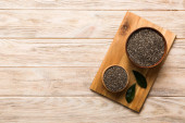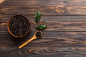 Nasiona szałwii w misce na kolorowym tle. Zdrowa hispanika Salvia w małej misce. Zdrowa superżywność.
