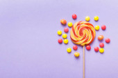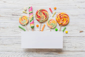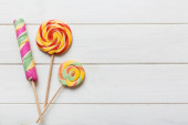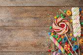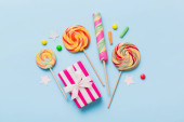 Smaczne akcesoria Party apetyczne Wszystkiego najlepszego z okazji urodzin Słodki. Różne rodzaje cukierków na kolorowym tle, przestrzeń kopiowania. Kolorowe tło strony urodzinowej.