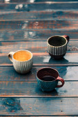3 filiżanki kawy na stole. Cappuccino Espresso Americano