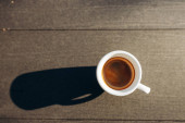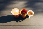 3 filiżanki kawy na stole. Cappuccino Espresso Americano