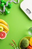 Koncepcja diety. Widok z góry zdjęcie talerzy z owocami orzechy sztućce taśma miara łuski i hantle na odizolowanym zielonym tle z copyspace