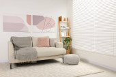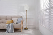 Zdjęcie "Panorama stylowej sypialni z dużym łóżkiem z aksamitem, ramą w kolorze ochry i zagłówkiem oraz duże okno z żaluzjami" może być wykorzystywane do celów osobistych i komercyjnych zgodnie z warunkami zakupionej licencji Royalty-free. Obraz jest dostępny do pobrania w jakości wysokiej rozdzielczości do 5760x3840.