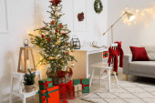 Zdjęcie "Wnętrze salonu z sofą, choinkami i kominkiem" może być wykorzystywane do celów osobistych i komercyjnych zgodnie z warunkami zakupionej licencji Royalty-free. Obraz jest dostępny do pobrania w jakości wysokiej rozdzielczości do 5760x3840.