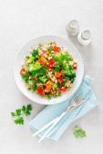 Zdjęcie "Sałatka Tabbouleh. Sałatka Tabouli ze świeżą pietruszką, cebulą, pomidorami, bulwą i ciecierzycą. Zdrowe wegetariańskie jedzenie, śródziemnomorska dieta. Widok z góry" może być wykorzystywane do celów osobistych i komercyjnych zgodnie z warunkami zakupionej licencji Royalty-free. Obraz jest dostępny do pobrania w jakości wysokiej rozdzielczości do 5760x3840.